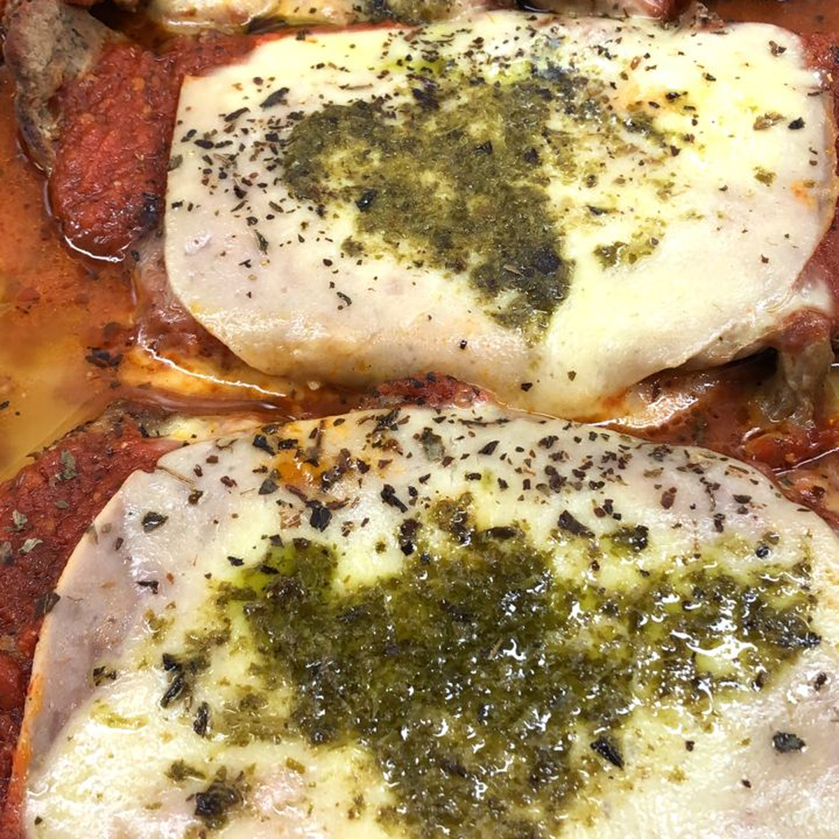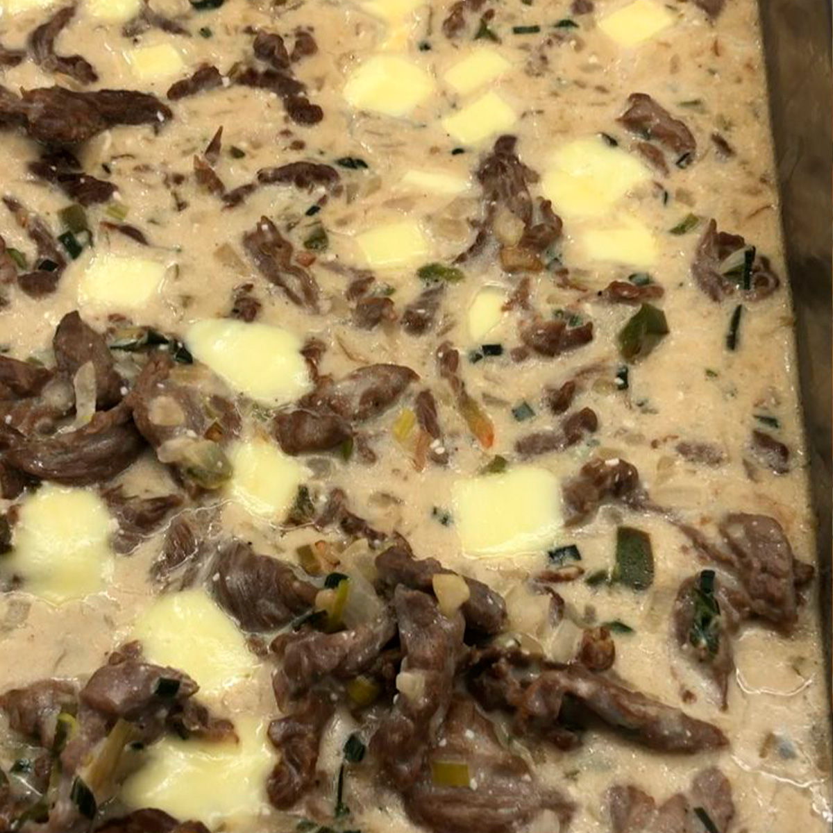 Tiras de carne en salsa de queso parmesano, mozarella, pecorino y rallado