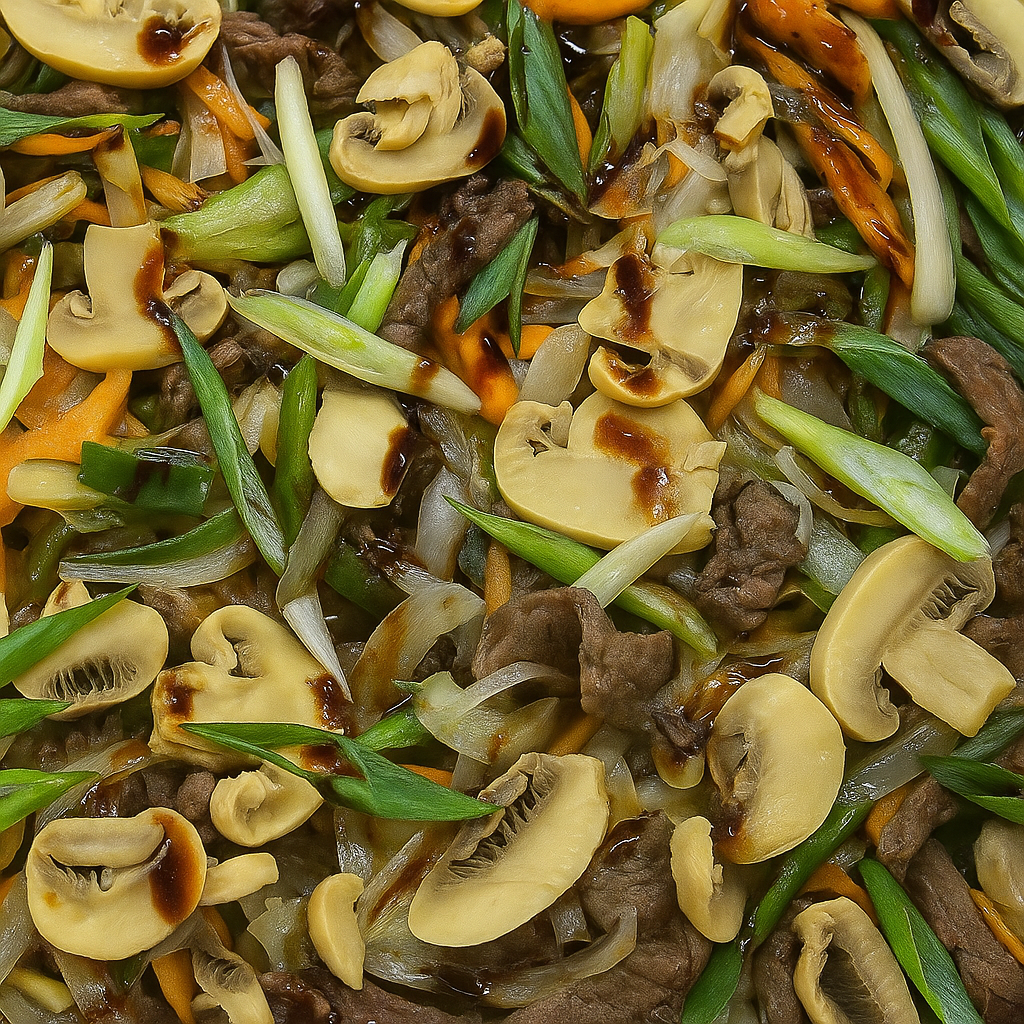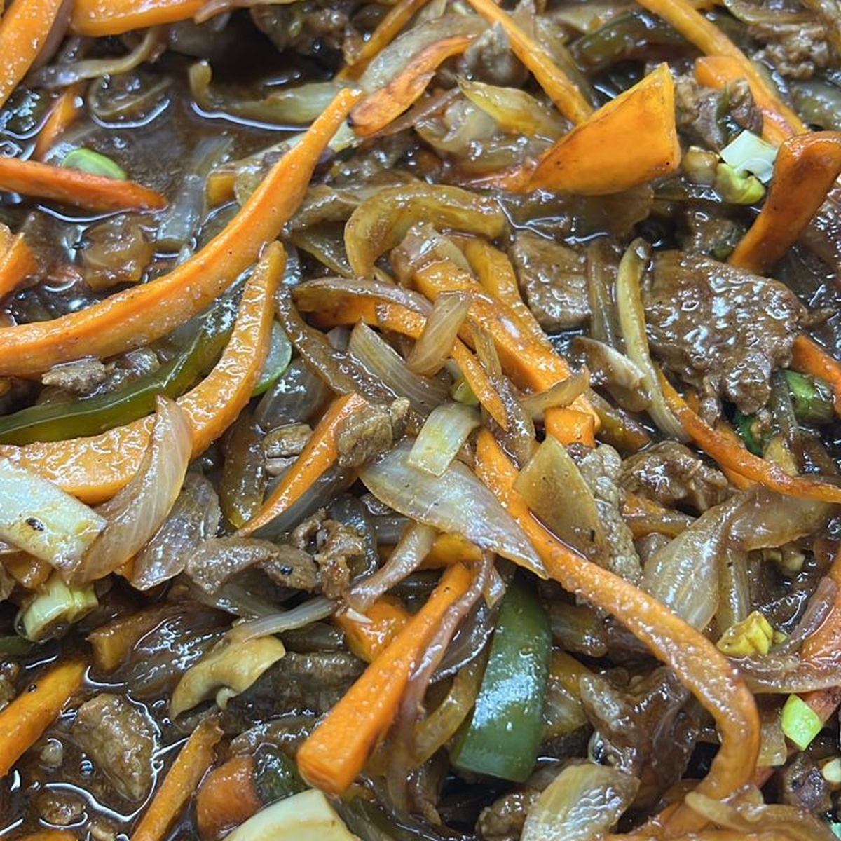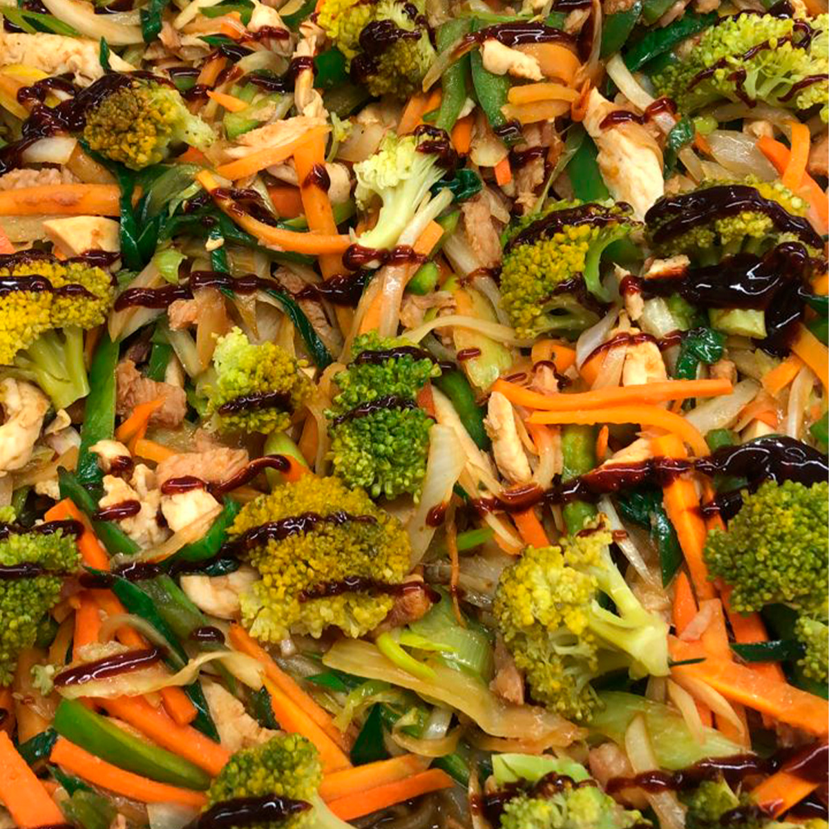 Trozos de carne y pollo cocinados en un wok con distintos tipos de verduras