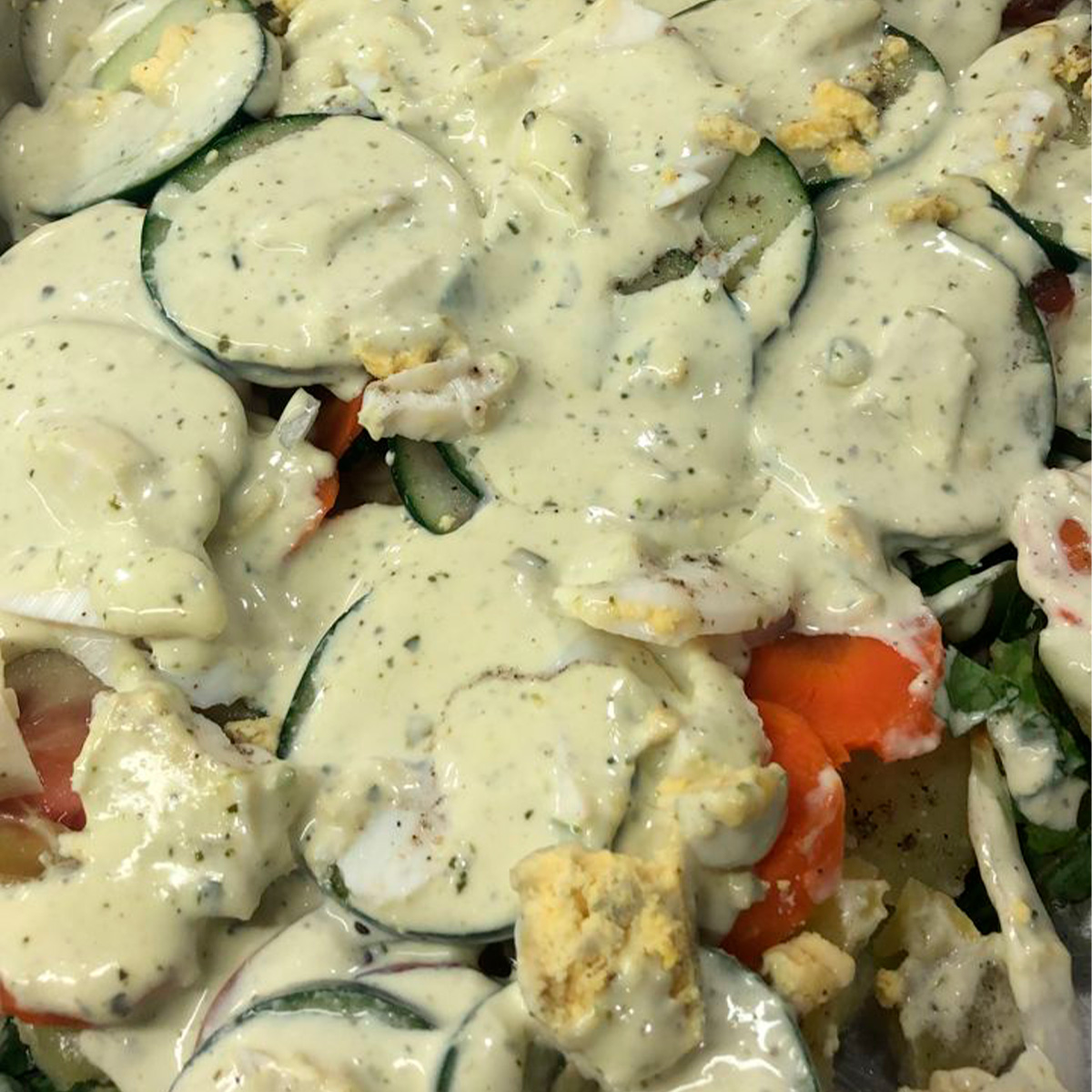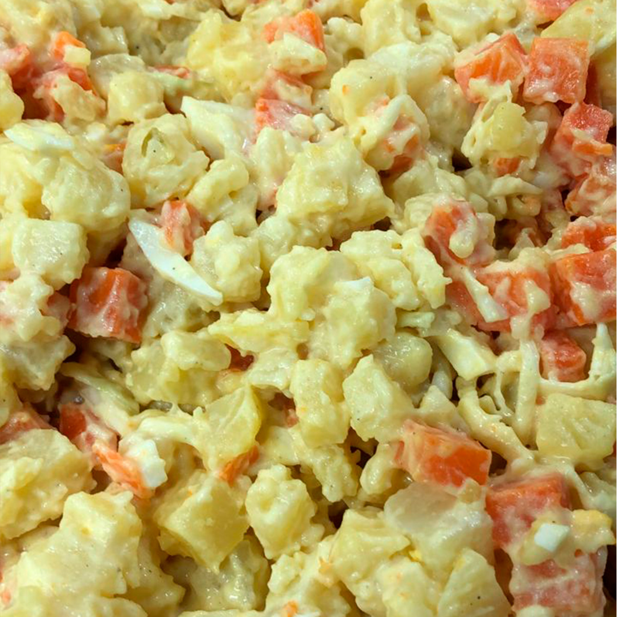 Ensalada de papas, remolacha y verduras cocidas con un aderezo de mayonesa