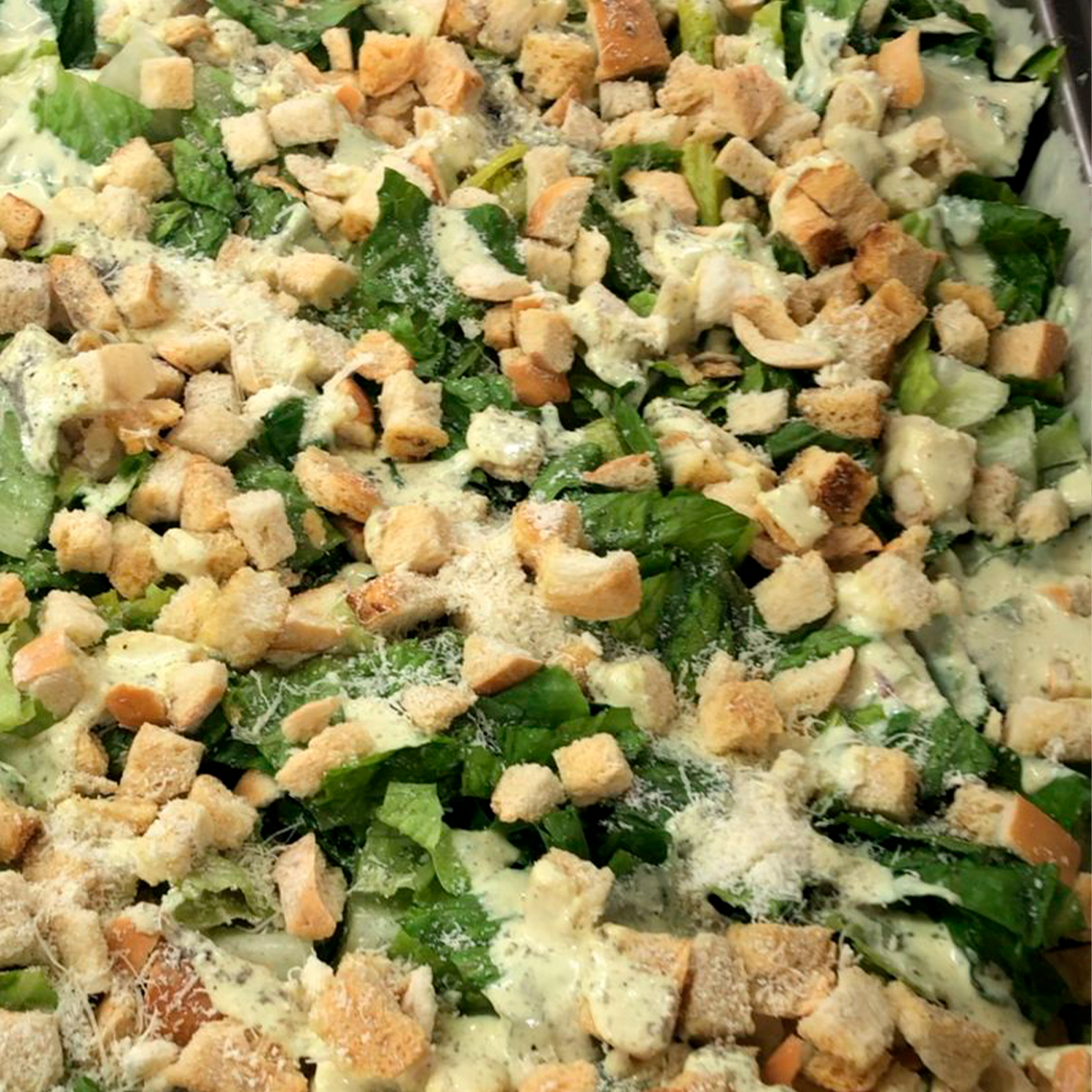 Lechuga romana y croûtons (trozos de pan tostado) con jugo de limón, aceite, huevo, salsa especial